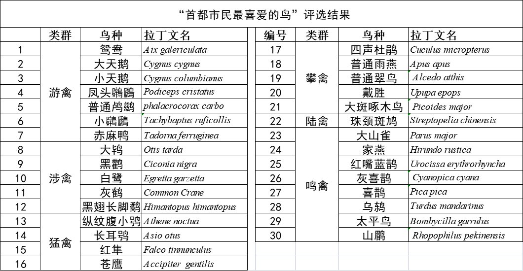 “首都市民最喜爱的鸟”评选结果。北京市园林绿化局供图